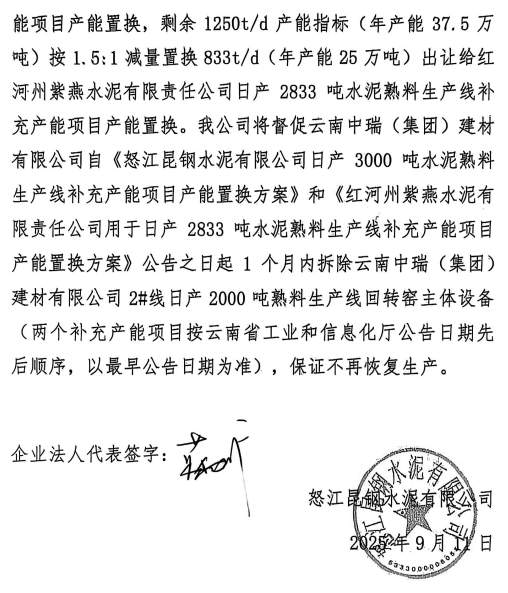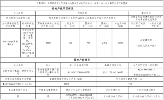根据公告,怒江昆钢水泥有限公司日产3000吨水泥熟料生产线补充产能项目原备案或核准文件设计产能2500t/d,补充产能500t/d,置换产能750t/d,置换比例为1.5:1。云南中瑞(集团)建材有限公司一条2000t/d水泥熟料线中的750t/d用于本项目置换产能,计划在本方案公告之日起1个月内拆除退出。