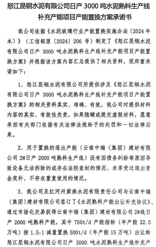怒江昆钢水泥有限公司日产3000吨水泥熟料生产线补充产能项目产能置换方案