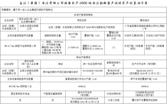 台泥(英德)水泥有限公司两条5000t/d水泥熟料线产能调整为两条6000 t/d,置换补充产能均为1000t/d,置换比例均为2:1。台泥(安顺)水泥有限公司一条4000t/d水泥熟料线用于本项目置换产能,计划履行资产处置程序后拆除。