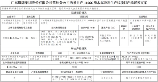 根据公告,广东塔牌集团股份有限公司蕉岭分公司两线日产11666吨新型干法水泥熟料生产线产能调整为两条11666t/d,置换补充产能均为3332t/d,置换比例均为1.5:1。梅州市塔牌集团蕉岭鑫达旋窑水泥有限公司一条5000t/d水泥熟料线用于本项目置换产能,计划履行资产处置程序后拆除。