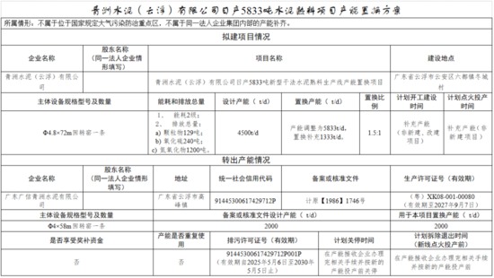 青洲水泥(云浮)有限公司一条4500t/d水泥熟料线产能调整为5833t/d,置换补充产能1333t/d,置换比例为1.5:1。广东广信青洲水泥有限公司一条2000t/d水泥熟料线用于本项目置换产能,计划在产能接收企业办理完相关手续并按新的产能投产前拆除退出。