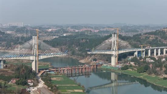 成达万高铁沱江特大桥钢混结合段首梁吊装完成