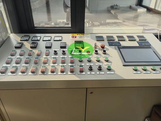 镜头下,一体化智能操作室被定制防护膜严密包裹,全触摸中控屏,实时显示生产数据、故障预警等信息,操作便捷高效。
